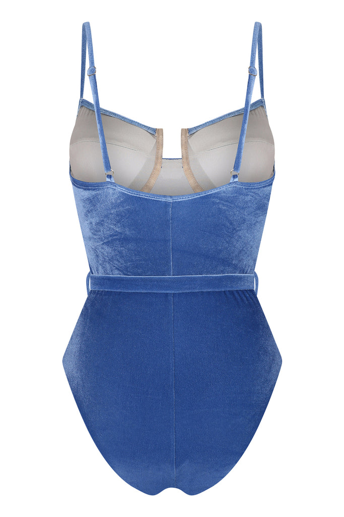 This high-leg one piece is designed with underwire cups, a scoop neck framed by slimmer straps that are removable and a belt with gold detailing.