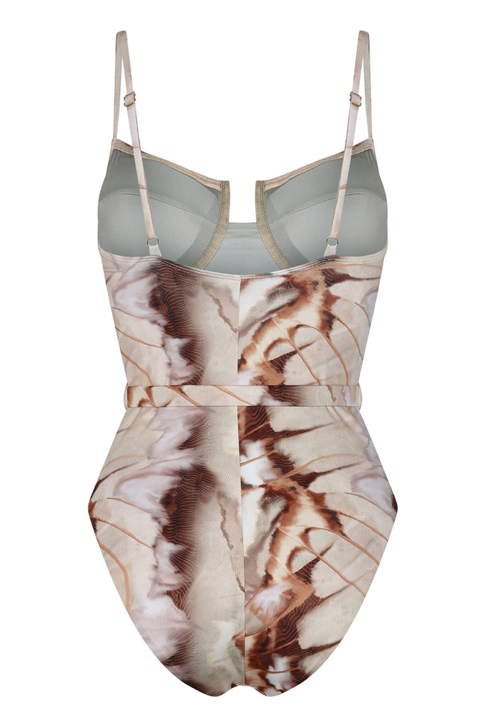 This high-leg one piece is designed with underwire cups, a scoop neck framed by slimmer straps that are removable and a belt with gold detailing.
