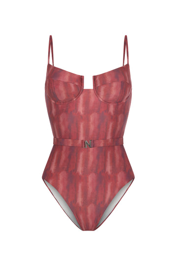 THIS HIGH-LEG ONE PIECE IS DESIGNED WITH UNDERWIRE CUPS, A SCOOP NECK FRAMED BY SLIMMER STRAPS THAT ARE REMOVABLE AND A BELT WITH GOLD DETAILING.