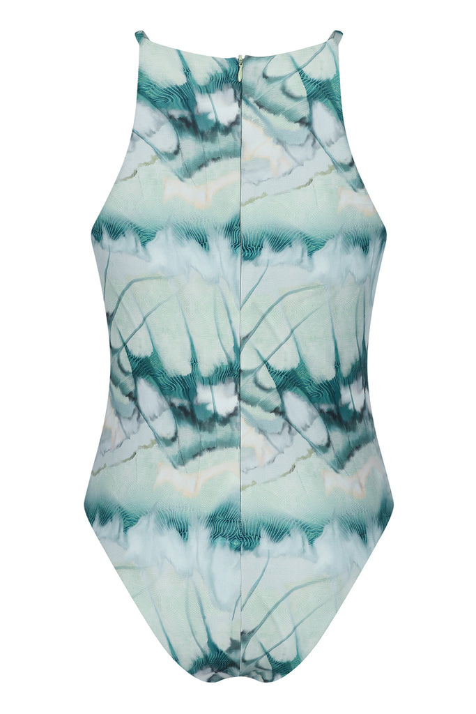 One piece halter neck with stone detailing on center of the plunging v-neck and zipper on the back