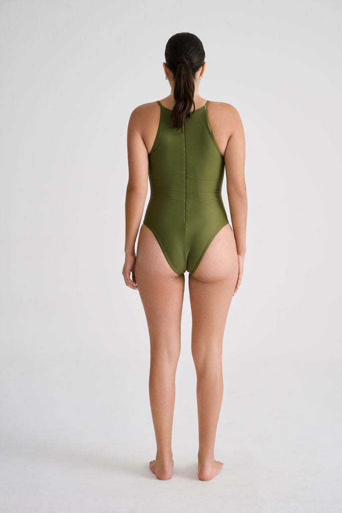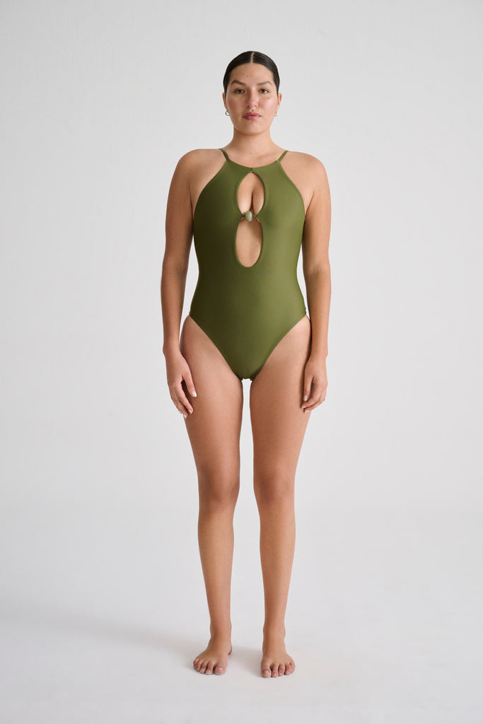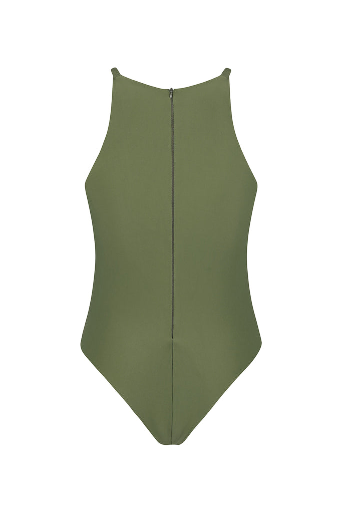 THIS HIGH-LEG ONE PIECE IS DESIGNED WITH UNDERWIRE CUPS, A SCOOP NECK FRAMED BY SLIMMER STRAPS THAT ARE REMOVABLE AND A BELT WITH GOLD DETAILING.