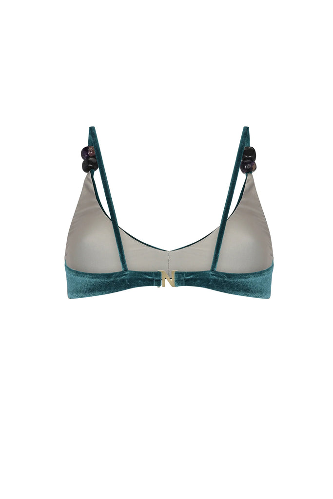 bralette bikini top with stone details on the straps and an embossed gold clip closure.