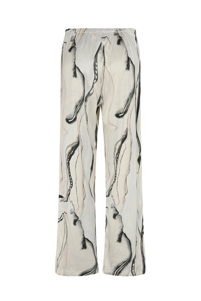 Wide-leg silk trousers with an adjustable elastic waistband for a comfortable, tailored fit.