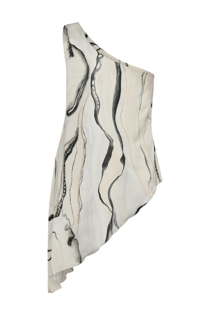 Asymmetric one-shoulder silk top featuring a gold spiral detail at the shoulder.