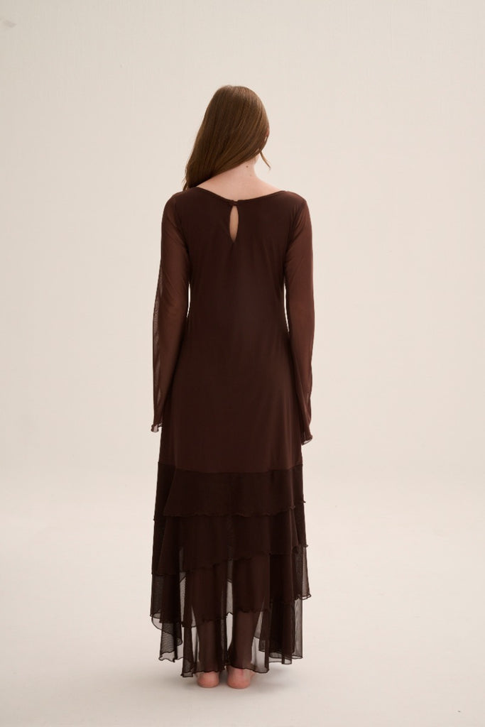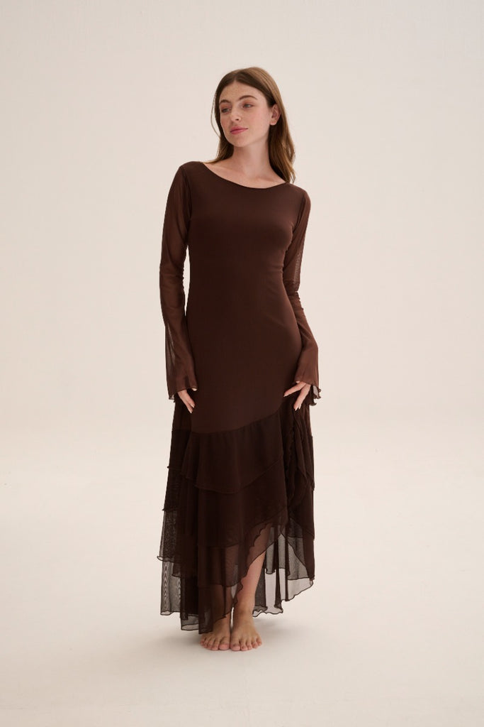 Maxi mesh dress with boat neck and ruffle details and asymmetric skirt.