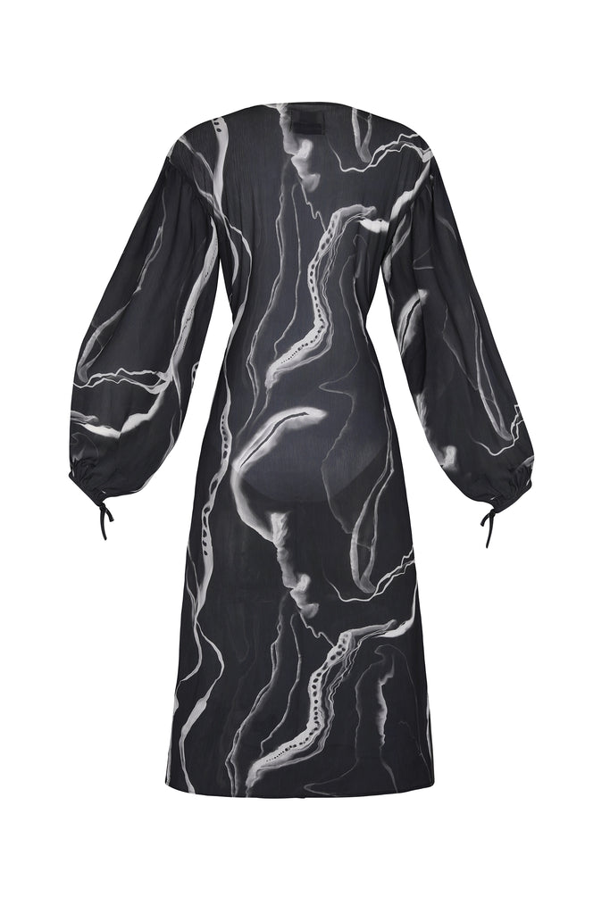 Classic long kimono with adjustable tie on the waist and puff sleeves.